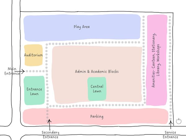 The southern part of the campus is meticulously allocated for parking, providing ample space for buses, two-wheelers, and four-wheelers, which can be accessed from the secondary street along the south edge of the campus. All the amenities are provided along the eastern edge of the campus with a service entrance from the secondary street in the south. The amenities include a busy canteen, a quiet library, workshops, and a store selling stationery - everything one need for a lively learning experience.