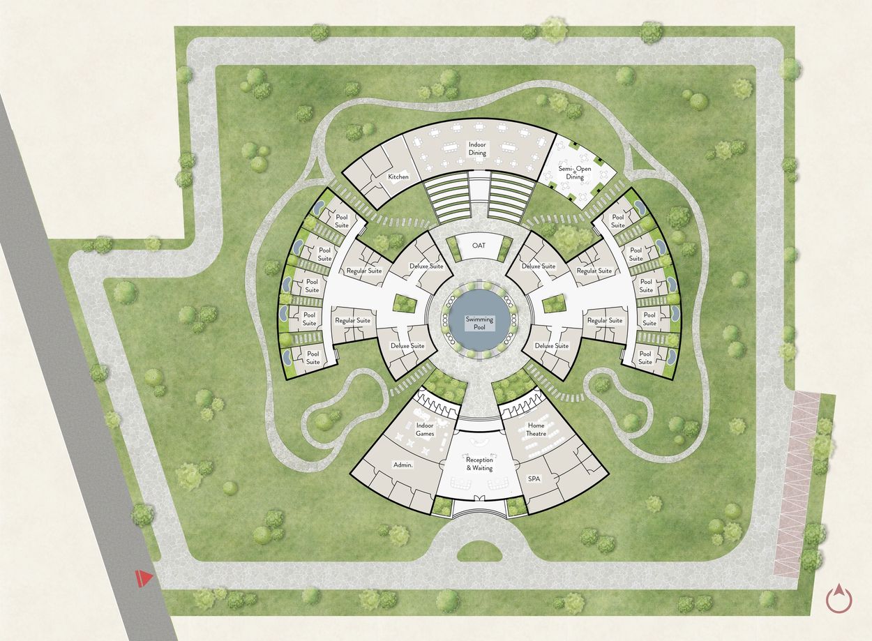 • Open-Air Theater & Dining Block: The theater uses the terrain for natural amphitheater seating, with a dining area behind it that includes indoor and semi-open spaces.